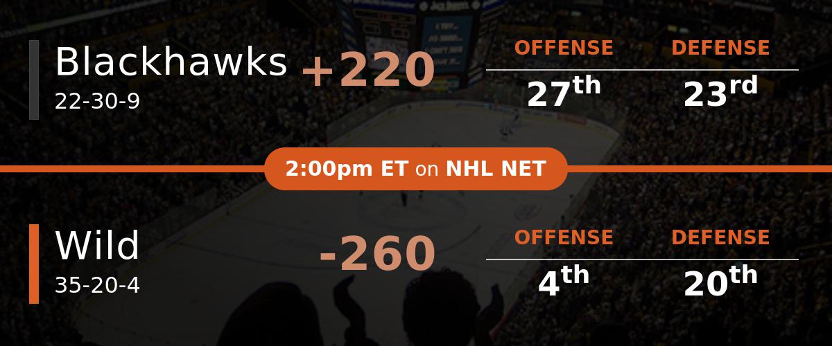 Wild vs. Blackhawks Prediction and Odds (Defense has Been Strong... Wild vs. Blackhawks Odds and Total. Moneyline The Wild rank third in high danger scoring chances against over their last 10 games, allowing only 9.08 per game, and the Blackhawks rank 10th in the NHL during that stretch, allowing only 10.59.